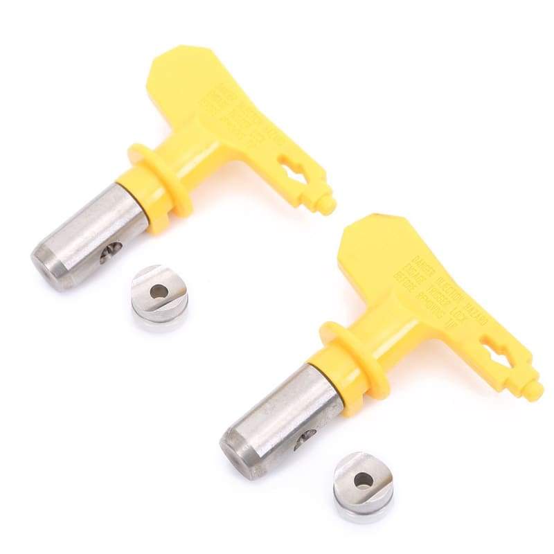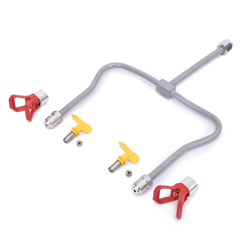• This airless paint sprayer extension pole has two tips spaced 6 inches apart that deliver a spray fan that’s twice the width of a spray gun or single-tip extension.