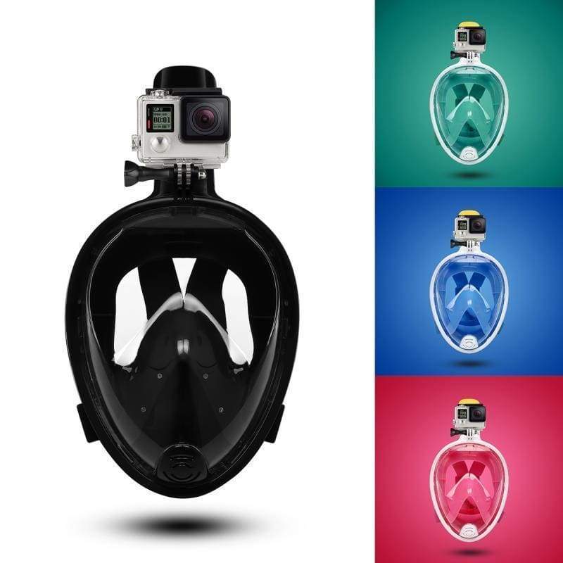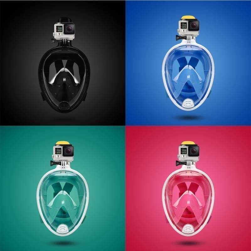 The Mask is Equipped with camera mount, to easily attached to GoPro camera to record or capture moments while being underwater. The mask has a top dry system that prevents water from getting-in while submerged in water. Has a soft seal silicone around the face and leakage can be drained-off by the drain valve via lift head.