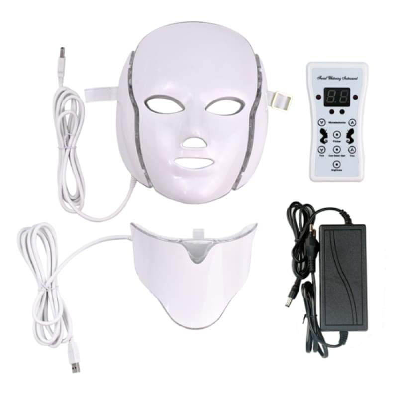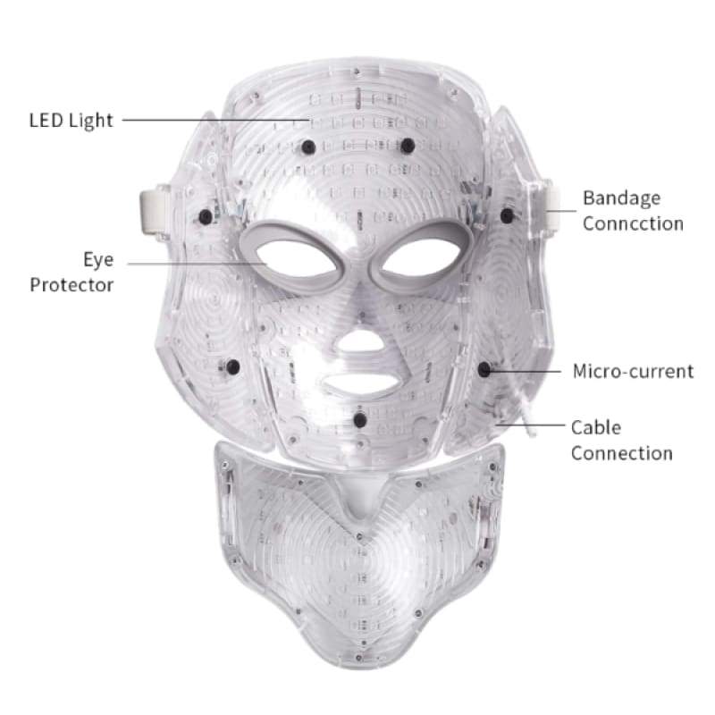 The photon mask has seven different color LED lights built-in that you can switch through, each color treating the skin in different aspects.
