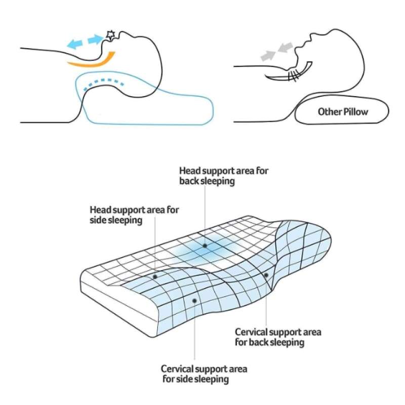 - Correctly positions your head and neck so you can sleep properly and wake up refreshed.