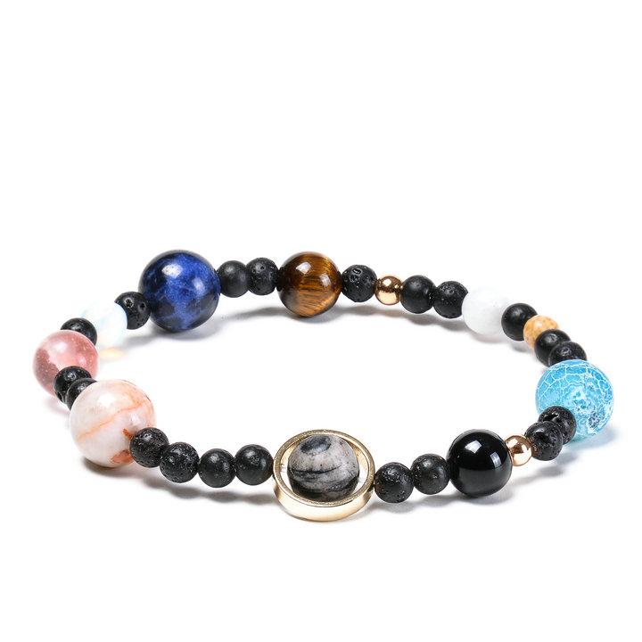 - FASCINATING COMPLETE PLANET STONES - Be captivated when you wear this admiring Miniverse Bracelet that has elegant stones that represents each planet: Mars: Pink Agate, Earth, Lan Ven Agate, Venus: Tiger Eye, Mercury: Howlite, Pluto: Brownstone, Neptune: Frosty Agate, Uranus: Cyan Agate, Saturn: Matte Map, Jupiter: Brown Agate and Moon: Moonstone. A set of stunning shiny stones that will surely complete your universe.