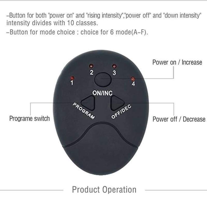 - AB Machine: This machine aims to strengthen and tighten abdominal muscles including the 8 pack abs, bicep, vastus lateralis muscle, vastus medialis muscle and so on. There are 6 modes and 10 intensities for choosing different frequency of vibration and current strength. The machine will shut off automatically after 12 minutes training. Keep on training 2 or 3 times every day correctly, will get a charming figure after 2 months.